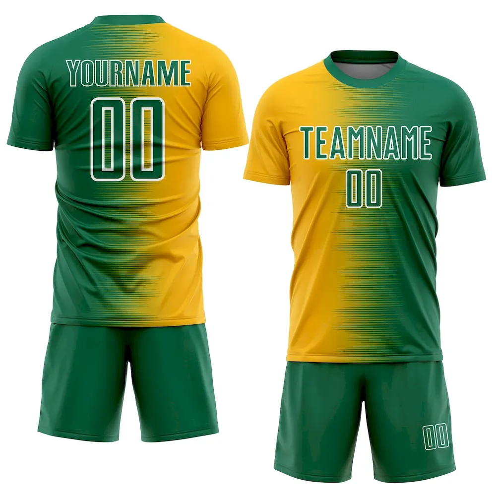 Custom Kelly Green Gold-White Gradient Line Sublimation Soccer Uniform Jersey