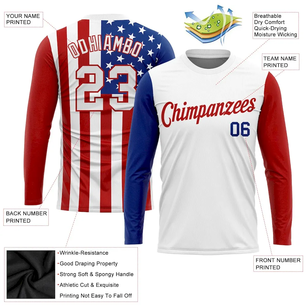 Custom White White Red-Royal American Flag Fashion 3D Long Sleeve Performance T-Shirt